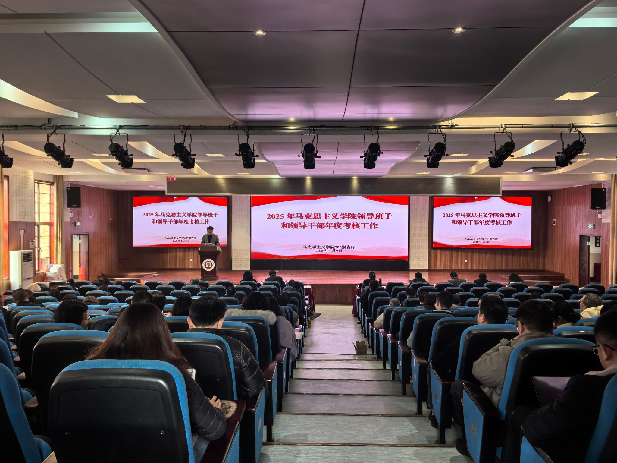 2026年1月9日下午,马克思主义学院2025年领导班子和领导干部年度考核和民主测评大会在学院505报告厅举行。学校党委宣传部副部长、党委网络工作部副部长金更兴同志、人才工作办公室高层次人才引进科科长刘凤妮同志出席会议,学院教职工参加会议,会议由学院党委书记吴文杰主持。