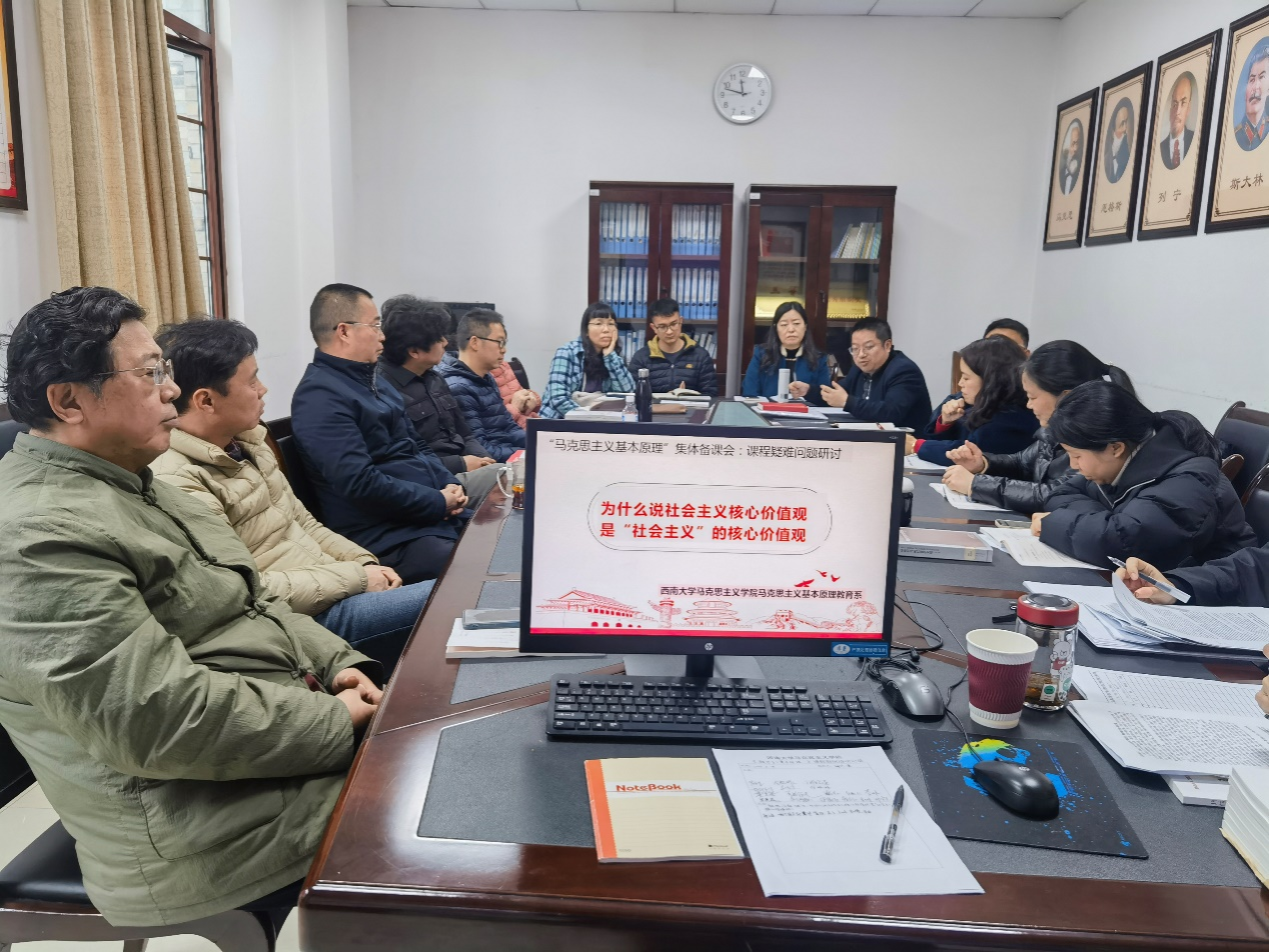 2025年3月14日,“原理”系全体教师在学院213会议室围绕“社会主义核心价值观为什么是‘社会主义’的核心价值”这一主题展开首次教学研讨暨集体备课会。集体备课会围绕既定主题,通过主讲教师分享、全体教师研讨的方式进行。本次集体备课由唐斌、陈子飞、杜丹、邓春芝四位老师主讲。学院副院长唐斌基于既有研究成果结合自己已发表的论文,深入阐释了社会主义核心价值观与社会主义制度、马克思主义理论、中华优秀传统文化、全人类共同价值之间的关系,通过与“普世价值”观的比较,从学理上厘清了社会主义核心价值观的根本性质。陈子飞老师基于社会主义核心价值观的历史发展,杜丹老师基于社会主义核心价值观的国际视野,邓春芝老师就如何融入“马克思主义基本原理”课程教学等方面进行了主题发言。备课会上老师们展开热烈讨论,学校原副校长崔延强老师高度肯定了这种具有问题意识的集体备课形式,他从社会主义核心价值观与全人类共同价值关系的视角进行了解读。胡刘老师从国际共产主义运动的视角、何玲玲老师从中国式现代化共性与个性的视角对这一主题做了进一步的探讨。